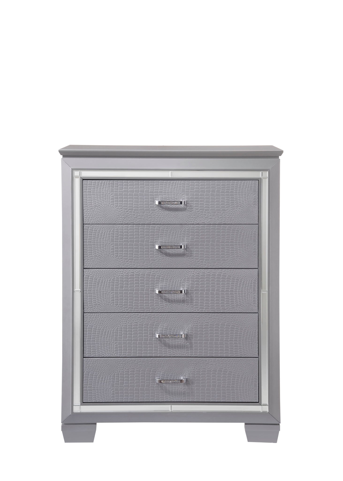 This bedroom collection offers a touch of glamour and luxury to any home. The chic silver finish paired with elegant textured panels creates a sophisticated look that can elevate any bedroom decor. The bed is a statement piece, featuring a stunning tufted headboard with integrated LED lighting that adds a classic touch to the modern design. Accompanying the bed is a selection of matching furniture pieces, including a dresser with a mirror, a tall chest, and nightstands, all finished in the same lustrous silver tone.