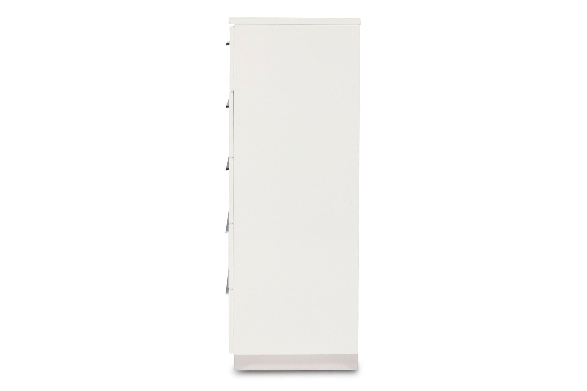 Enhance your bedroom with the Sapphire Modern 5-Drawer Chest in high gloss white. Crafted from high-quality manufactured wood, this chest features a flawlessly smooth, ripple-free surface and a glossy white laminate finish for a sleek, contemporary look. The design is accented by elongated chrome drawer pulls and silver mylar bases that catch and reflect light, creating a striking modern effect. Inside, the roomy drawers offer ample storage with durable dovetail joinery and smooth full-extension slides for effortless use. Combining stylish design with practical functionality, this chest is perfect for adding a touch of sophistication to your space.
