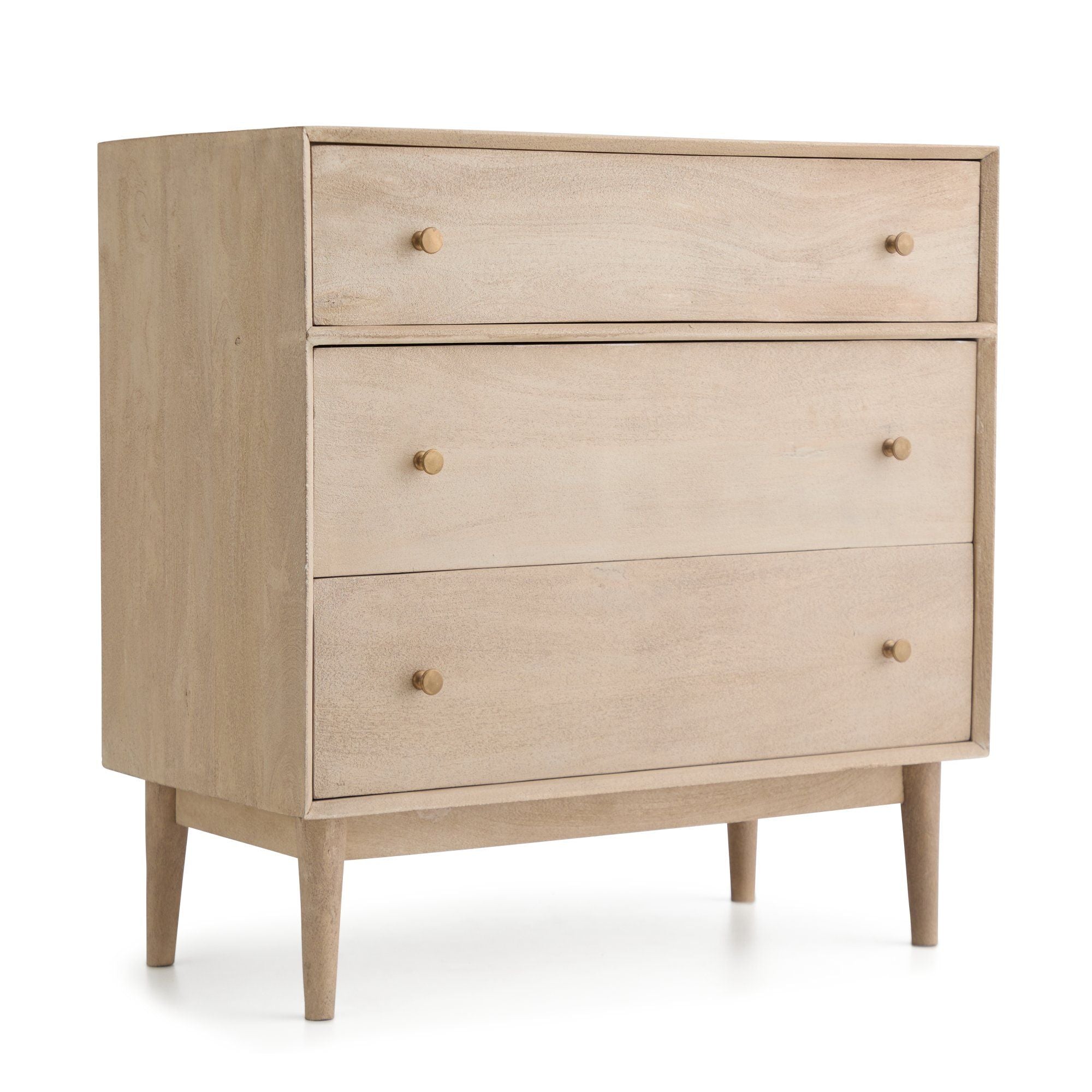 A three-drawer chest inspired by mid-century modern design with wood glides and tapered legs.