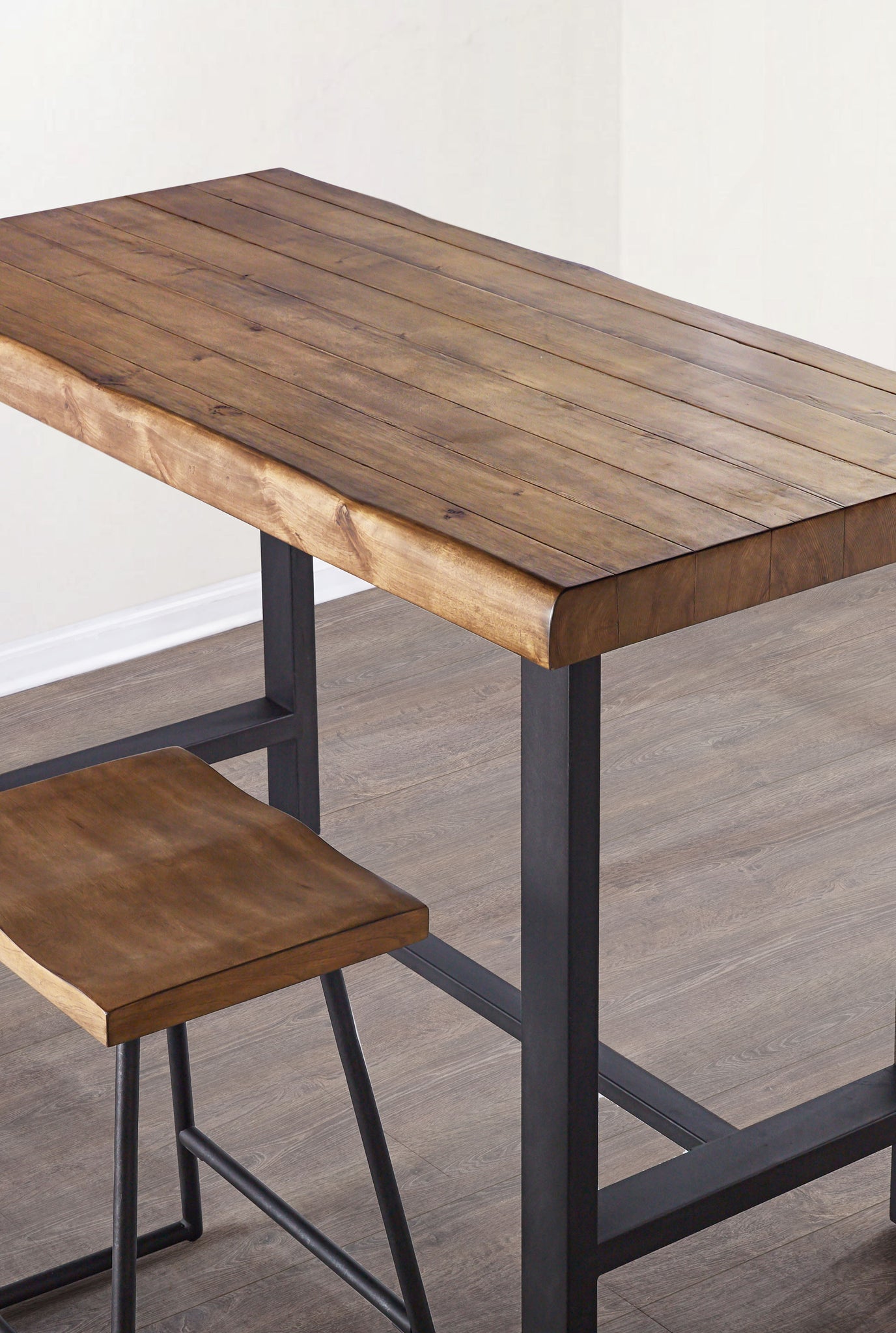 You'll love to come to dinner with this counter height set from Landon! This transitionally styled mixed media set presents a substantial look in a medium-sized dining package. The beefy table top features birch veneers in a natural honey finish and is paired with a weighty iron base. The wooden seated stool has a rustic appearance while sporting a shaped seat for added comfort.