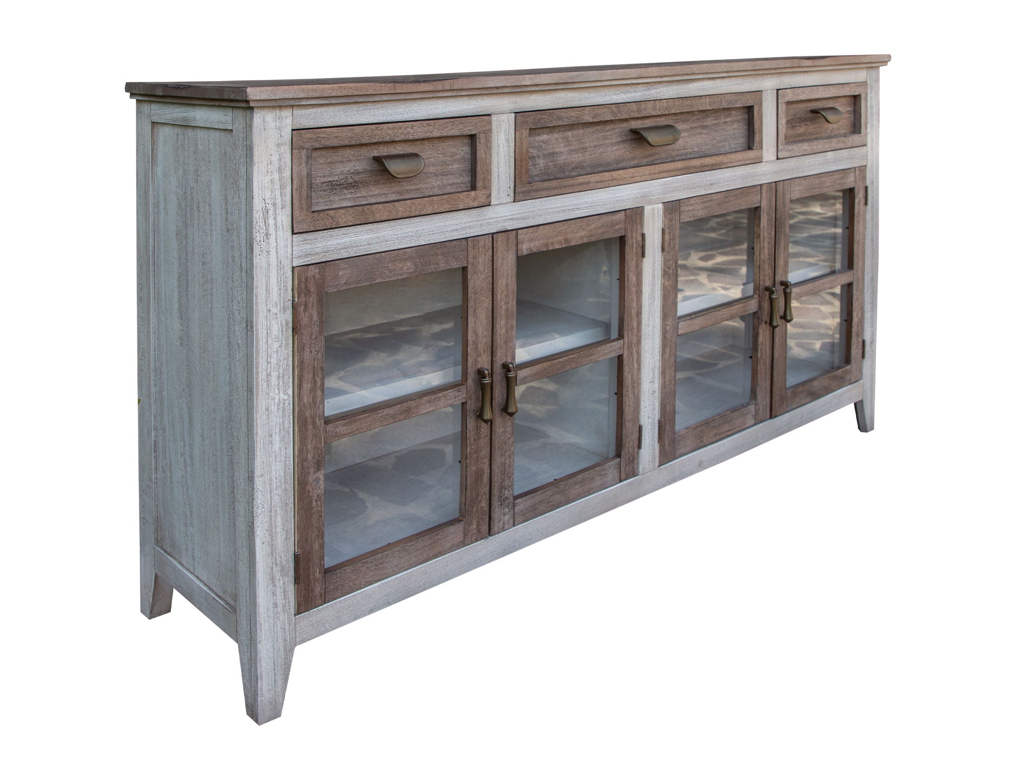 3 Drawer 4 Glass Door Console. Introducing Sahara, an organic modern collection designed to transform your space into a tranquil and neutral haven. Crafted from sustainably sourced, lightly distressed mango wood, this stunning minimalistic collection effortlessly blends style and sustainability, making it a perfect fit for any space.