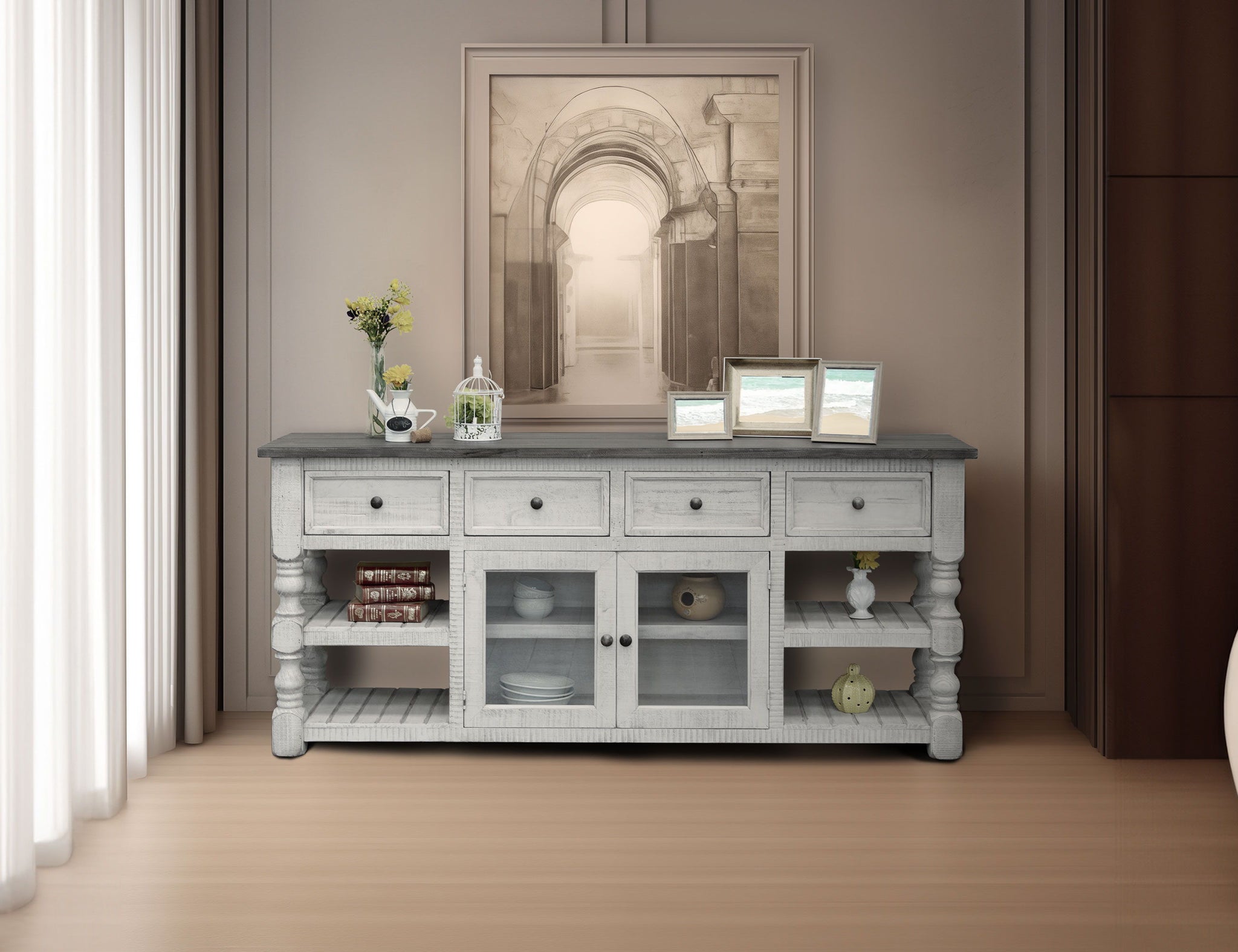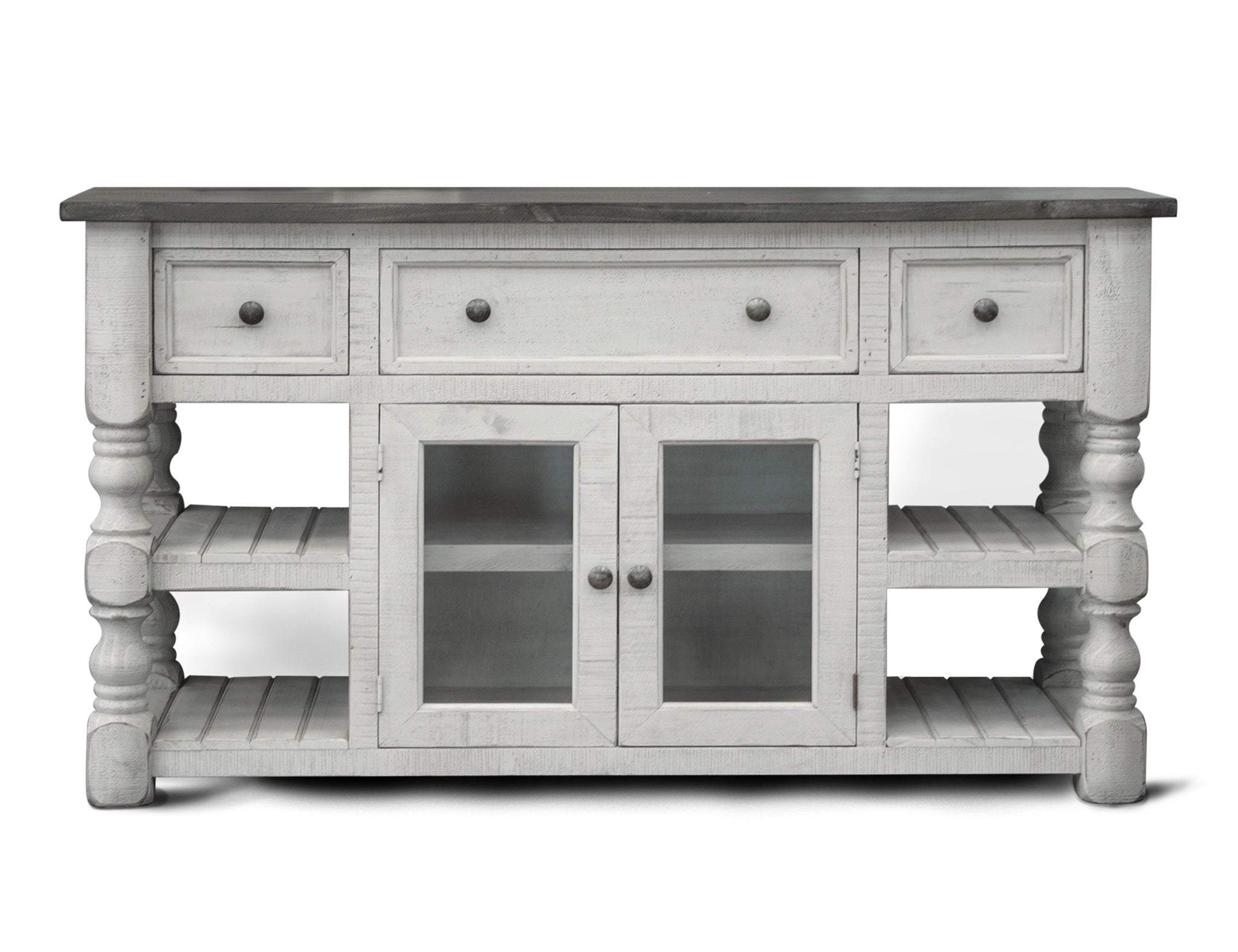 3 Drawer 2 Glass Door TV Stand. Exuding farmhouse chic with just the right touch of old-world charm, the Stone Collection is meticulously crafted from solid pine wood. The wood is lightly distressed, showcasing a white finish and complemented by weathered gray tops.