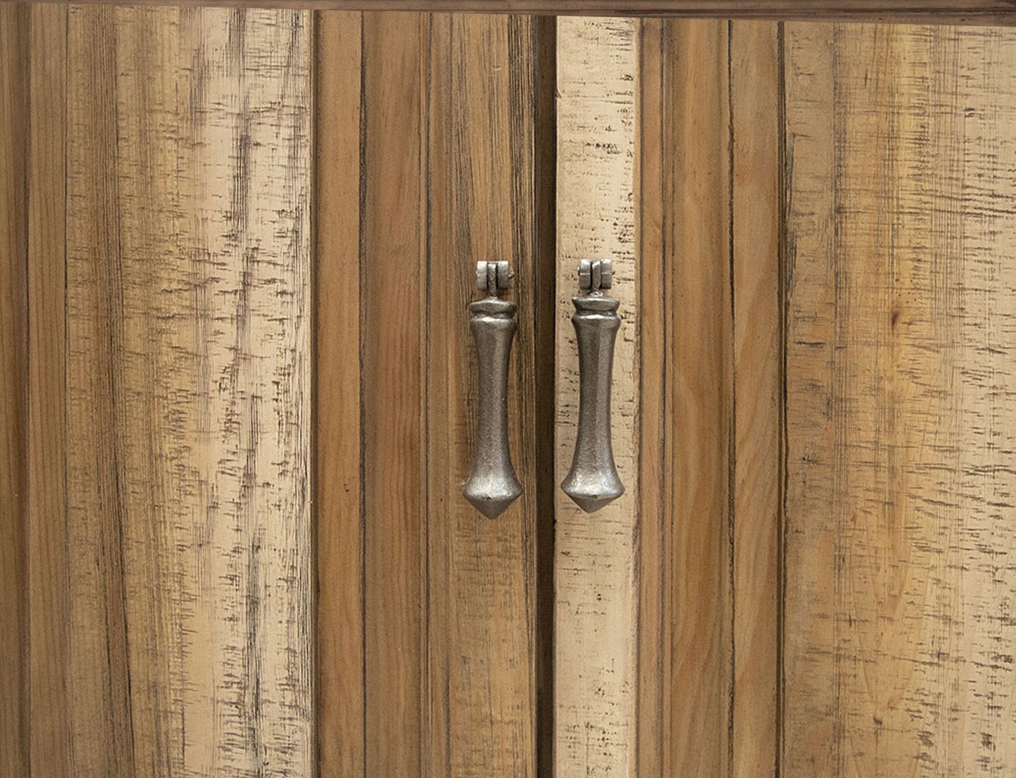 - Finish is achieved through a multi-step process in which pine is lightly distressed, and hand-applied two-tone lacquer in hues of light brown is used.