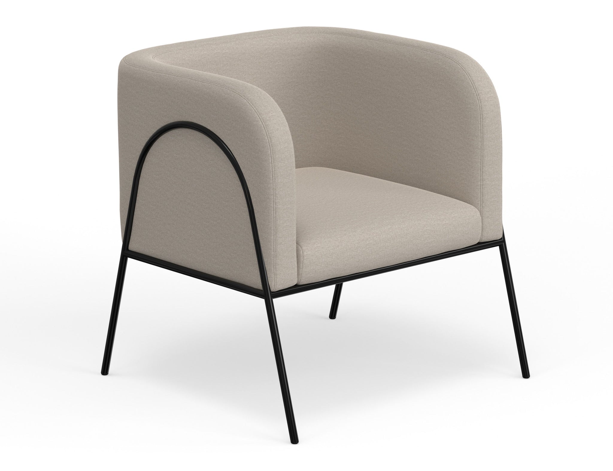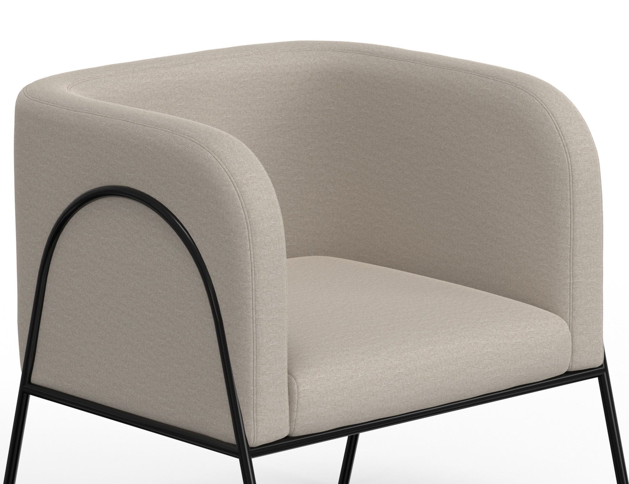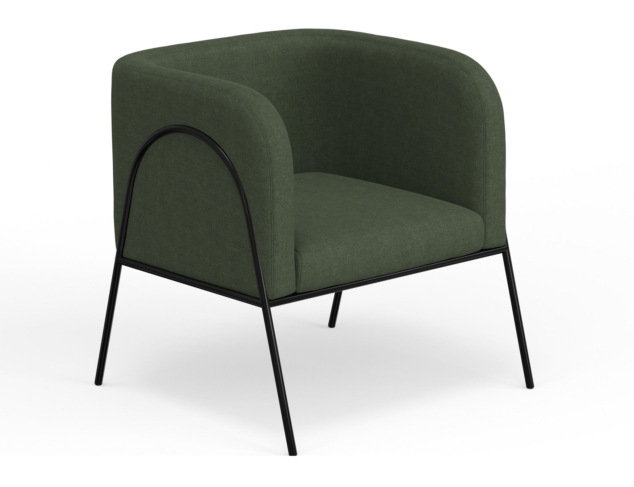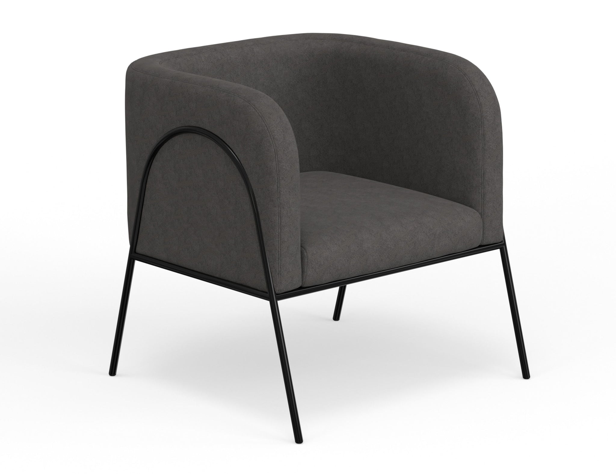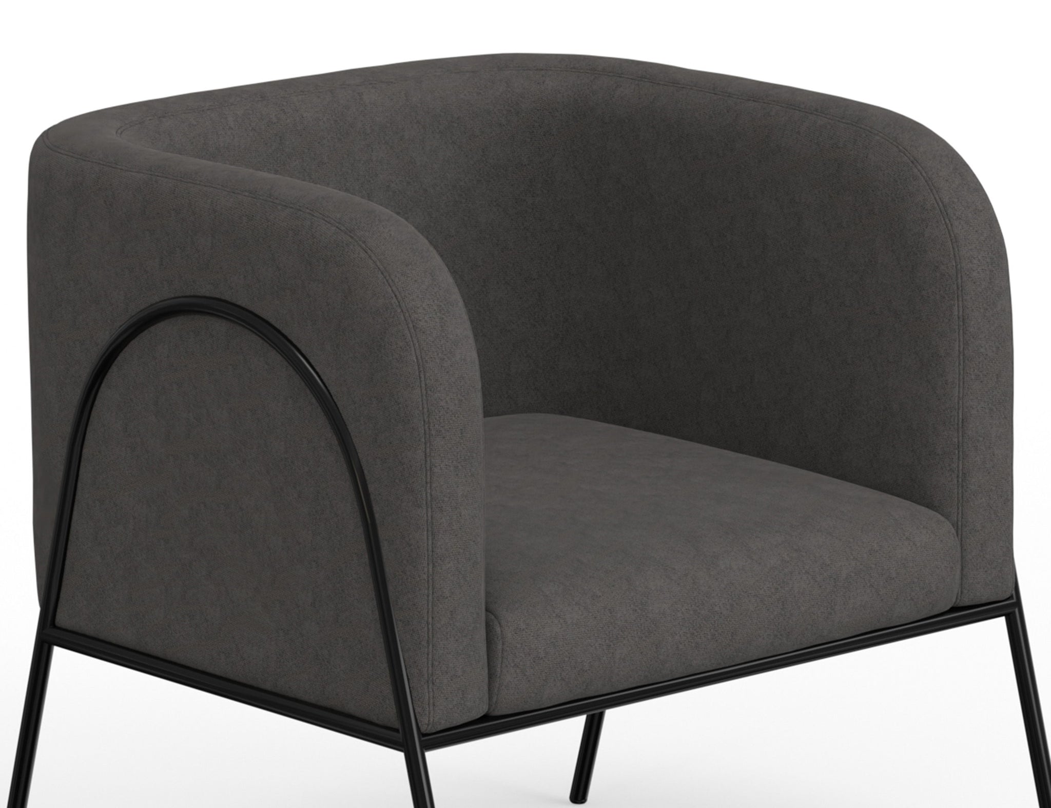 Wooden Frame & Metal Base, Armchair. This barrel chair not only provides a comfortable haven for reading but also adds a touch of modern sophistication to your space. Crafted with precision, it boasts an engineered wood frame supported by sleek black metal legs. The chair's defining characteristic is its elegantly rounded back, which gracefully extends around the sides to double as embracing armrests, cocooning you in comfort and style