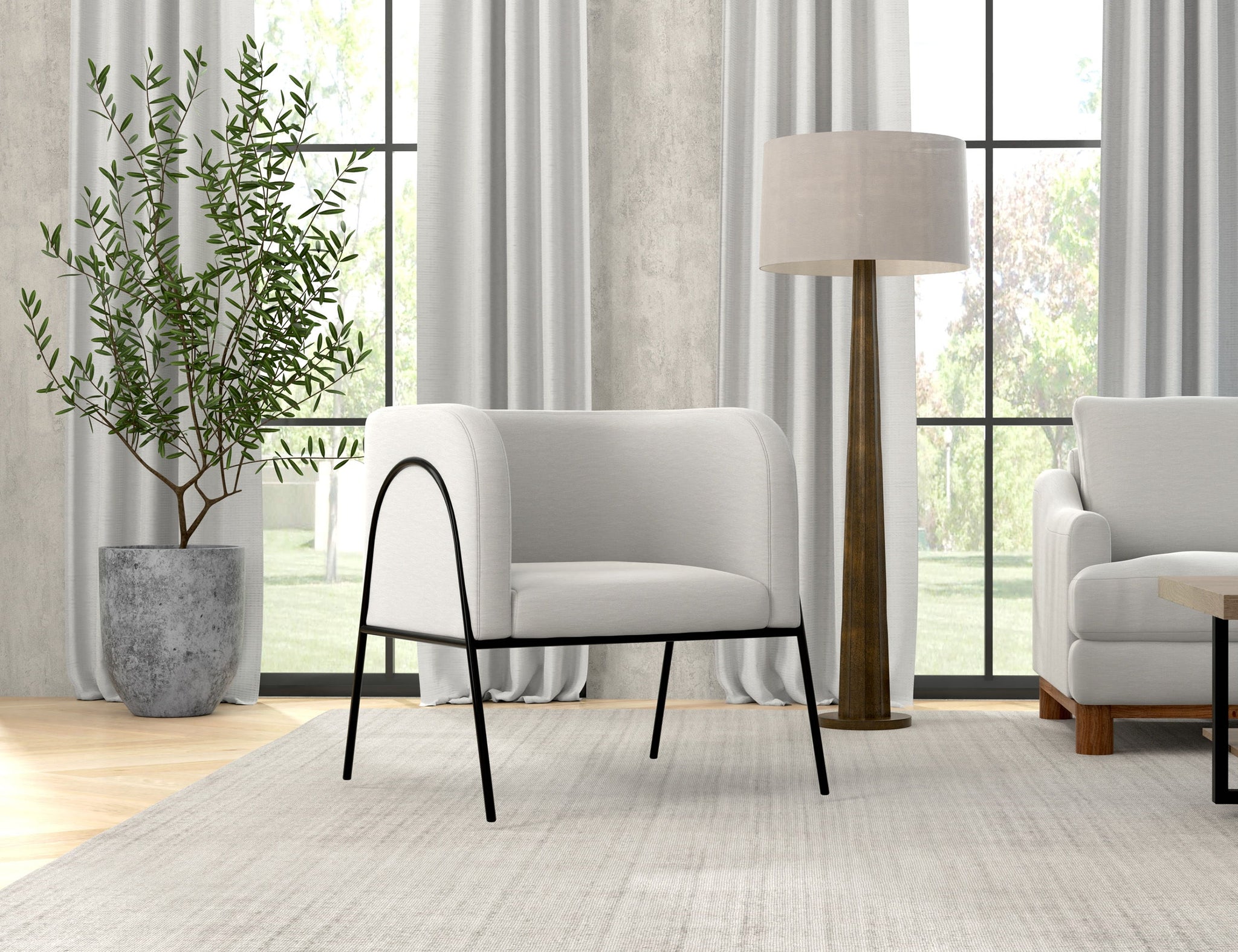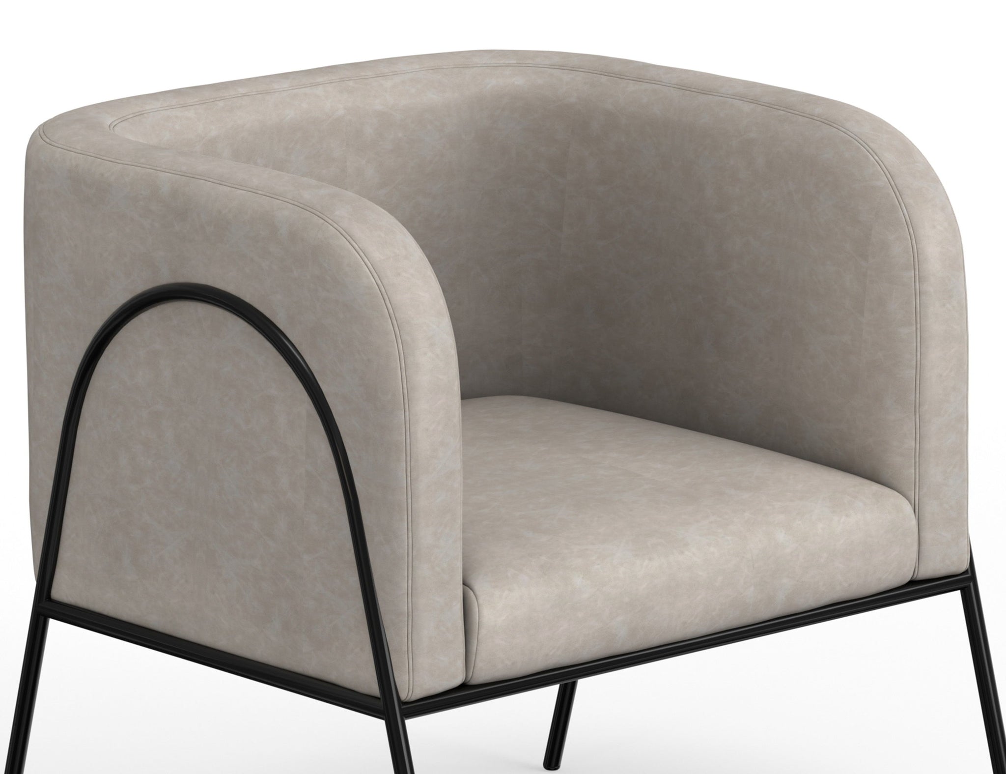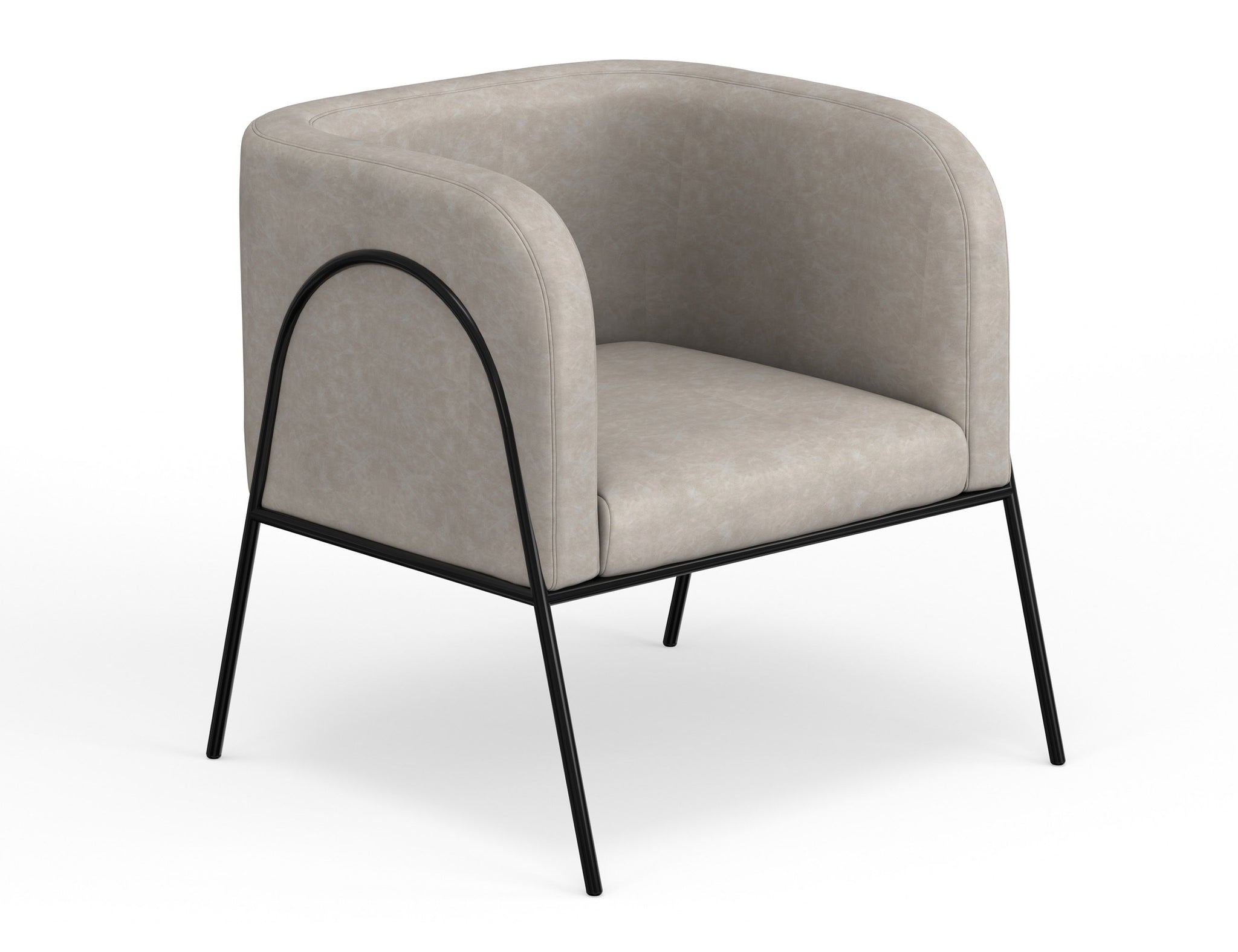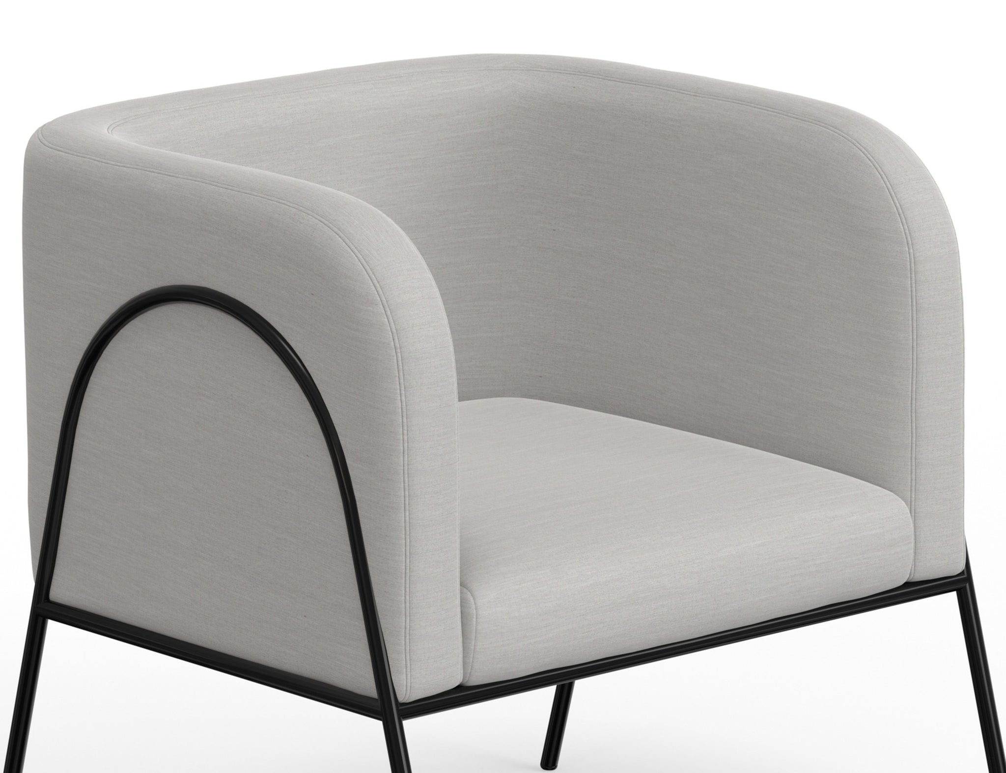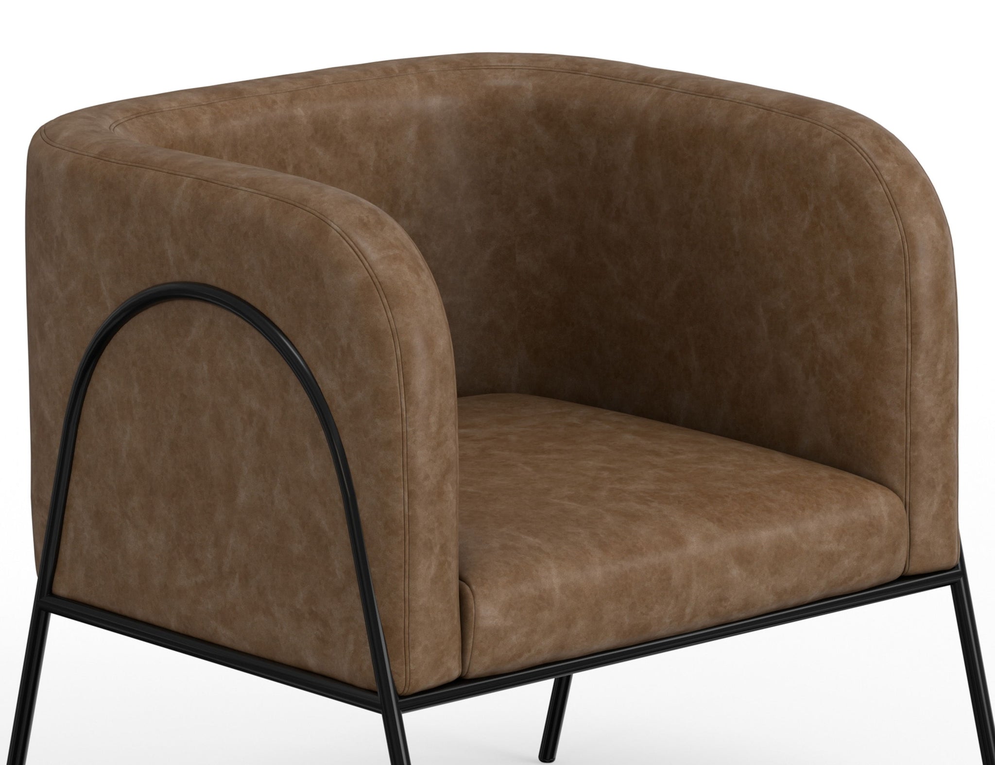 Wooden Frame & Metal Base, Armchair. This barrel chair not only provides a comfortable haven for reading but also adds a touch of modern sophistication to your space. Crafted with precision, it boasts an engineered wood frame supported by sleek black metal legs. The chair's defining characteristic is its elegantly rounded back, which gracefully extends around the sides to double as embracing armrests, cocooning you in comfort and style
