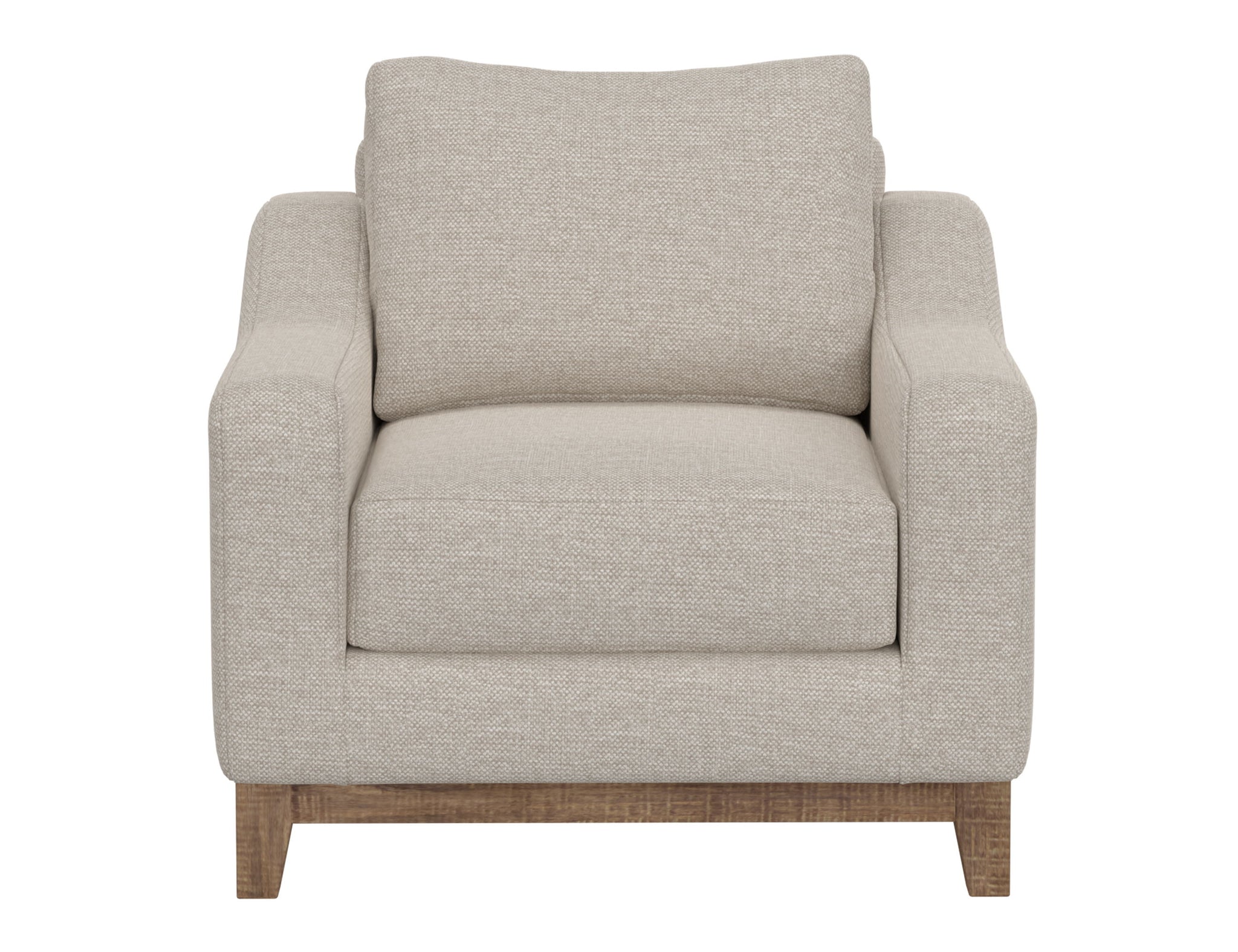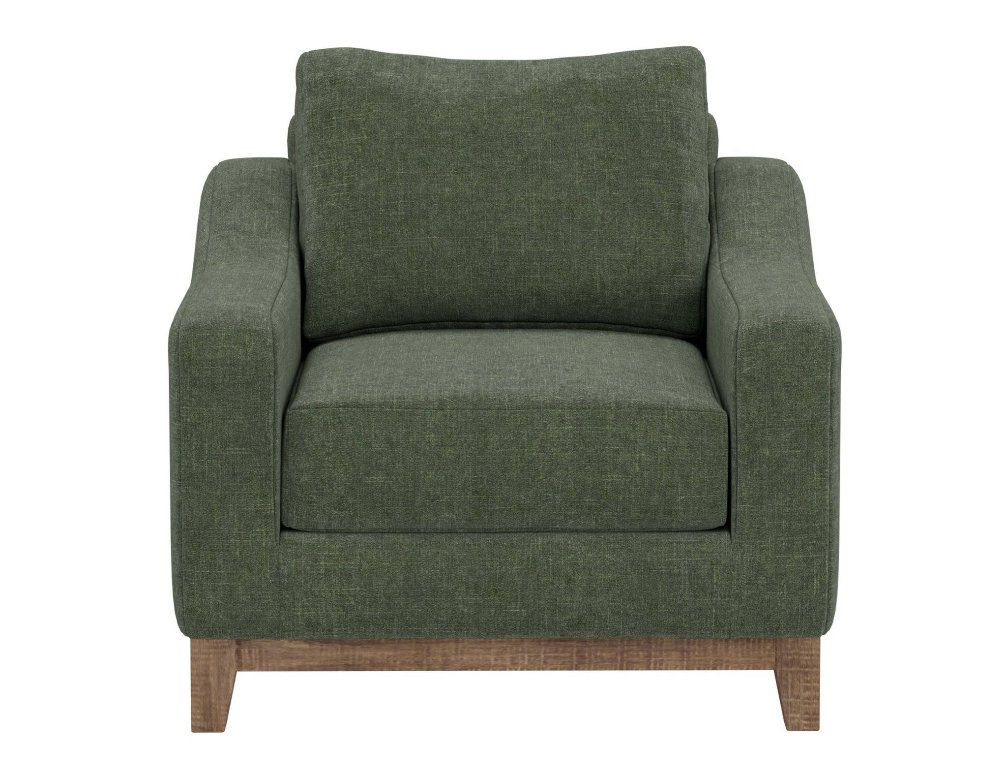 Wooden Frame & Base, Armchair. The Olivo collection seamlessly blends clean lines with a harmonious fusion of both organic and geometric shapes, offering unparalleled comfort for your space with its mid-century modern style, marked by subtle curves on padded armrests.