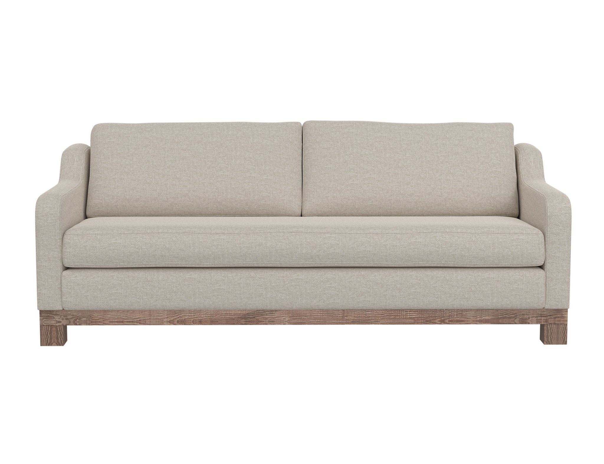 Wooden Frame & Base, Two-Cushion Sofa. With its chunky, wide silhouette, the Samba collection infuses your living room with a touch of traditional charm. Supported by a sturdy frame crafted from solid pine wood, it rests gracefully on low-profile block feet with a rich hue.