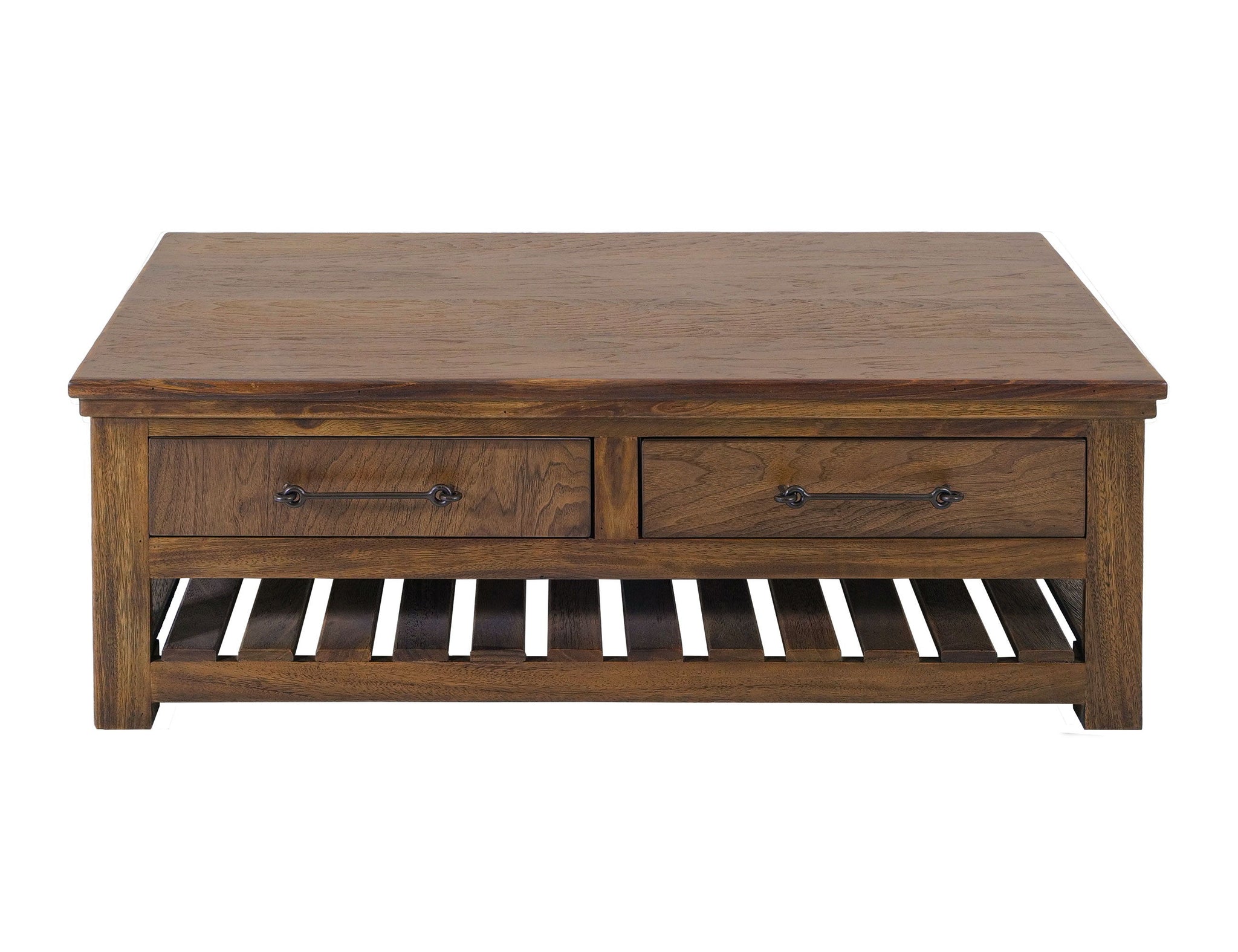4 Drawer, Cocktail Table. The Walnut Occasional Tables Collection is the perfect addition to your living space. It blends sophistication with essential utility to create a refined atmosphere. Crafted from parota wood with walnut veneer tops. These tables feature a translucent multi-step lacquer finish in a rich reddish-brown tone that highlights the natural beauty of the wood. They are equipped with custom pulls and a slatted shelf underneath for extra storage, combining practicality with style. The Cocktail Coffee table features wheels for easy mobility, allowing effortless movement.
