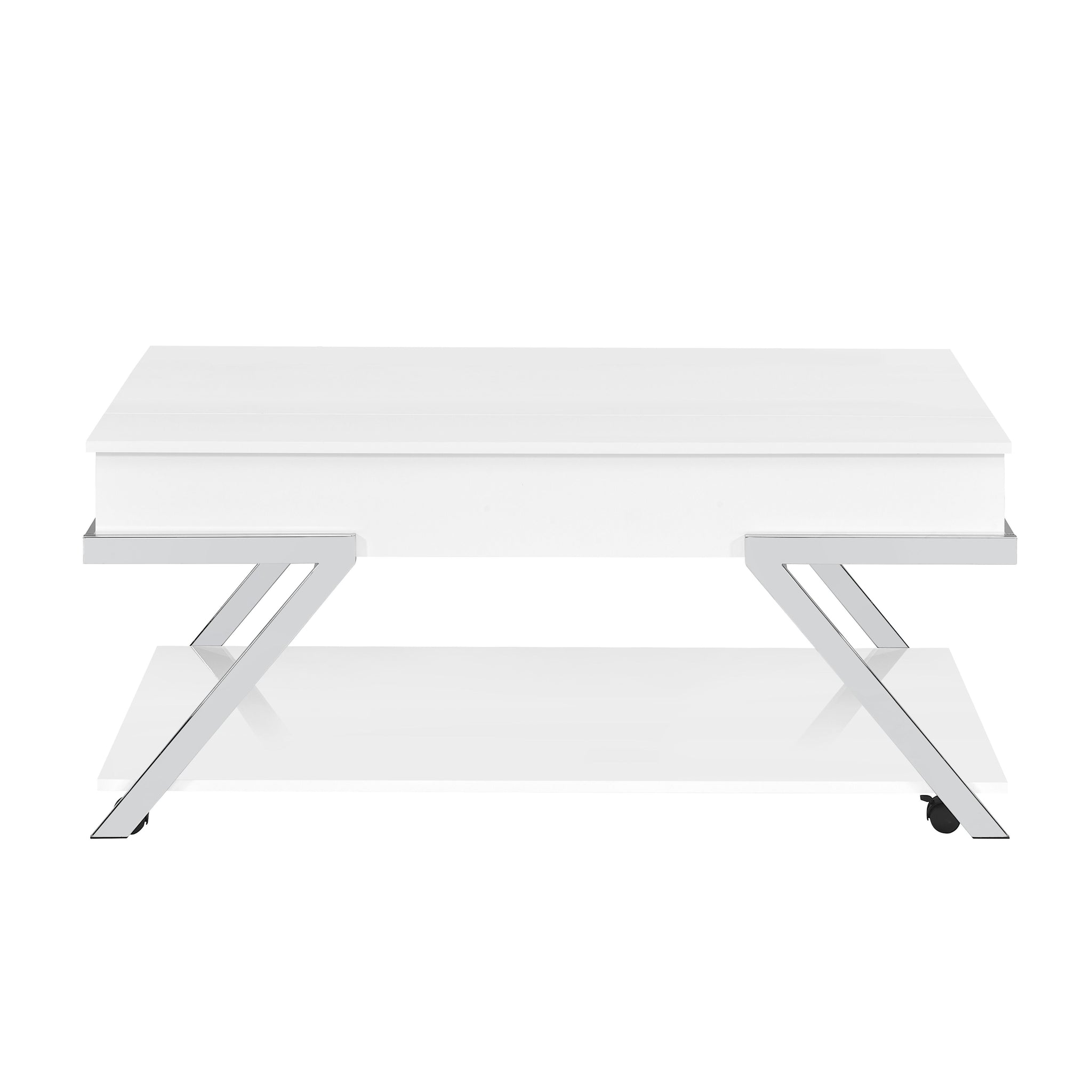 Midcentury modern meets glam in the Zena Lift-Top Cocktail Table. Full of function, this Cocktail Table allows you to work or dine in your living room with a simple pull of the top. The canted chrome legs are complemented with a white finish for a silhouette that is neutral but not boring. Four casters move the table with ease, out of the way of reclining furniture or just merely to clean around. Ample storage for living room essentials is available with the bottom shelf and under the lift-top. Great looking and full of function, Zena is a great centerpiece to any modern living room