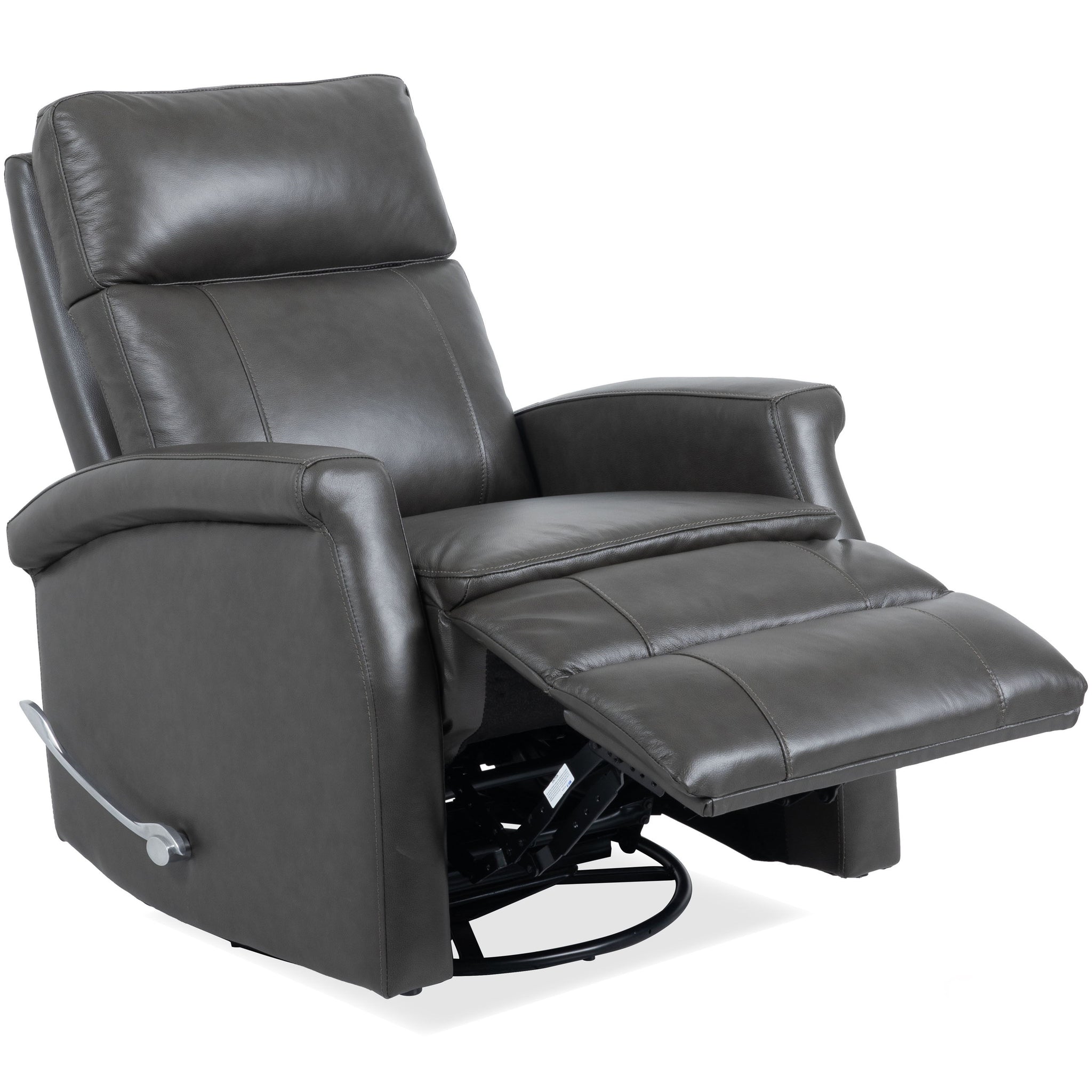 The Bristol swivel glider recliner is stylish and functional for any living space. It features a transitional key arm, a nickel-finished handle, and an easy-to-use reclining feature. Bristol is covered in soft leather, swivels 360 degrees, and is made using sustainably sourced woods in a solar-powered facility, ensuring quality and environmental responsibility.