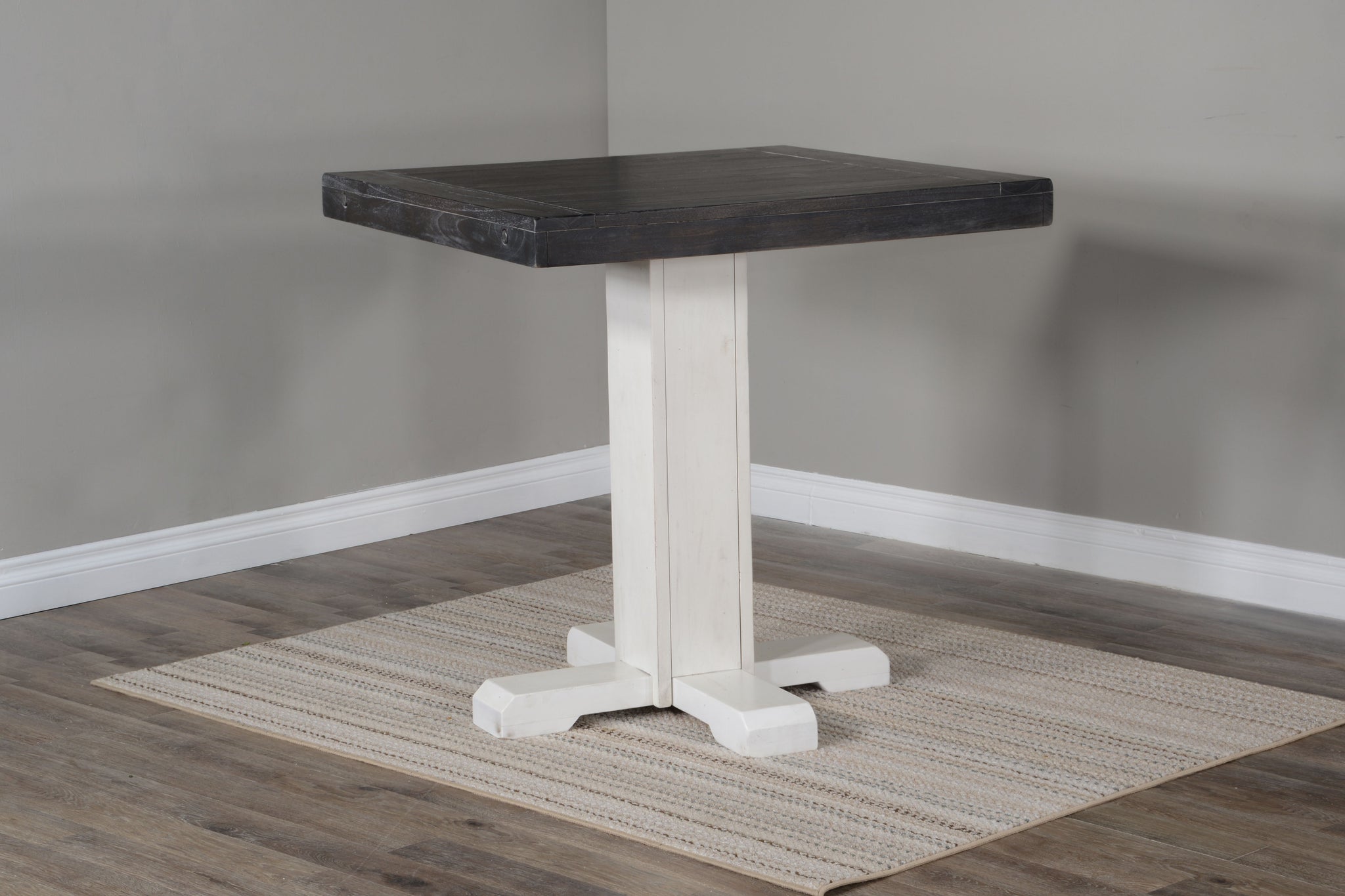 This pub table is the perfect addition to any small kitchen or game room. Crafted with mindi and mahogany solids and veneers.