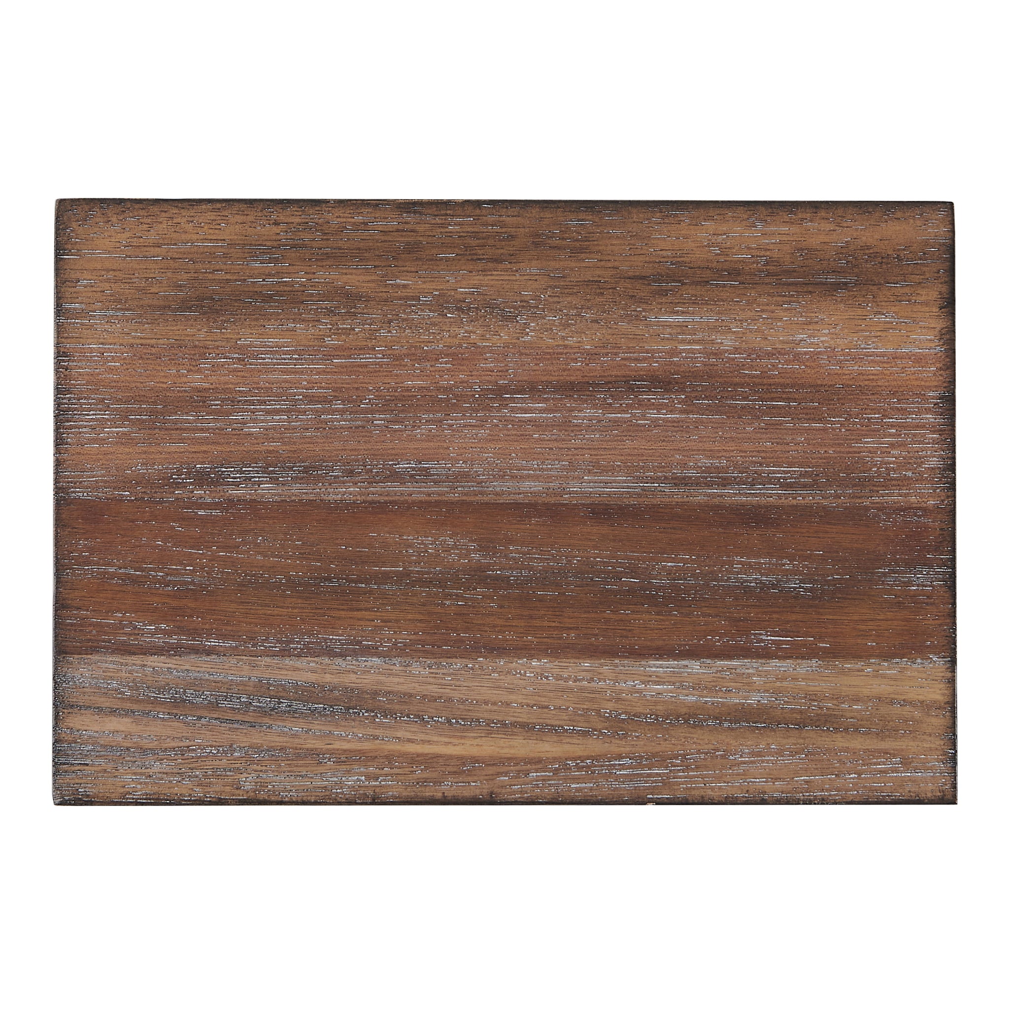 - Crafted of elm, Acacia and other veneers, engineered woods and black coated iron base