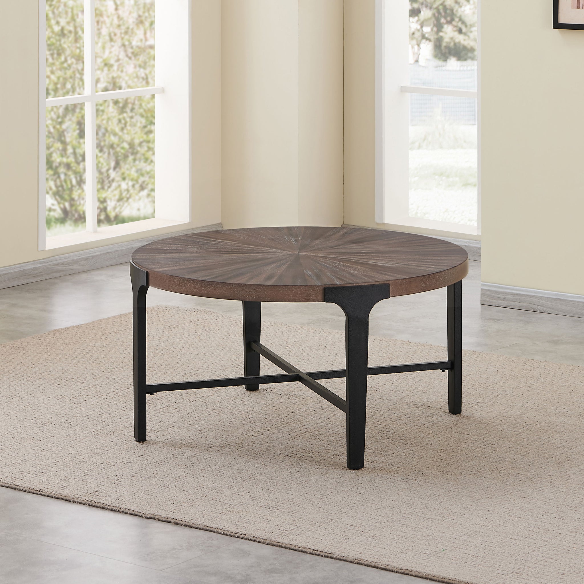 The Chevron 36-inch round coffee table masterfully blends modern minimalism with rustic elements in a mixed media centerpiece for a warm and cozy living room. An ideal choice for contemporary spaces, its sleek, round shape and modest size are perfect for smaller living areas, ensuring functionality without overwhelming the space. The table's top, crafted from elm, Acacia, and other veneers, is finished in a natural cinnamon shade, highlighting the wood's grain and knots. This hand-stained finish adds a rustic charm, contrasting with the modern, black-coated iron base. The round shape works great with sectionals or sofa and loveseat sets.