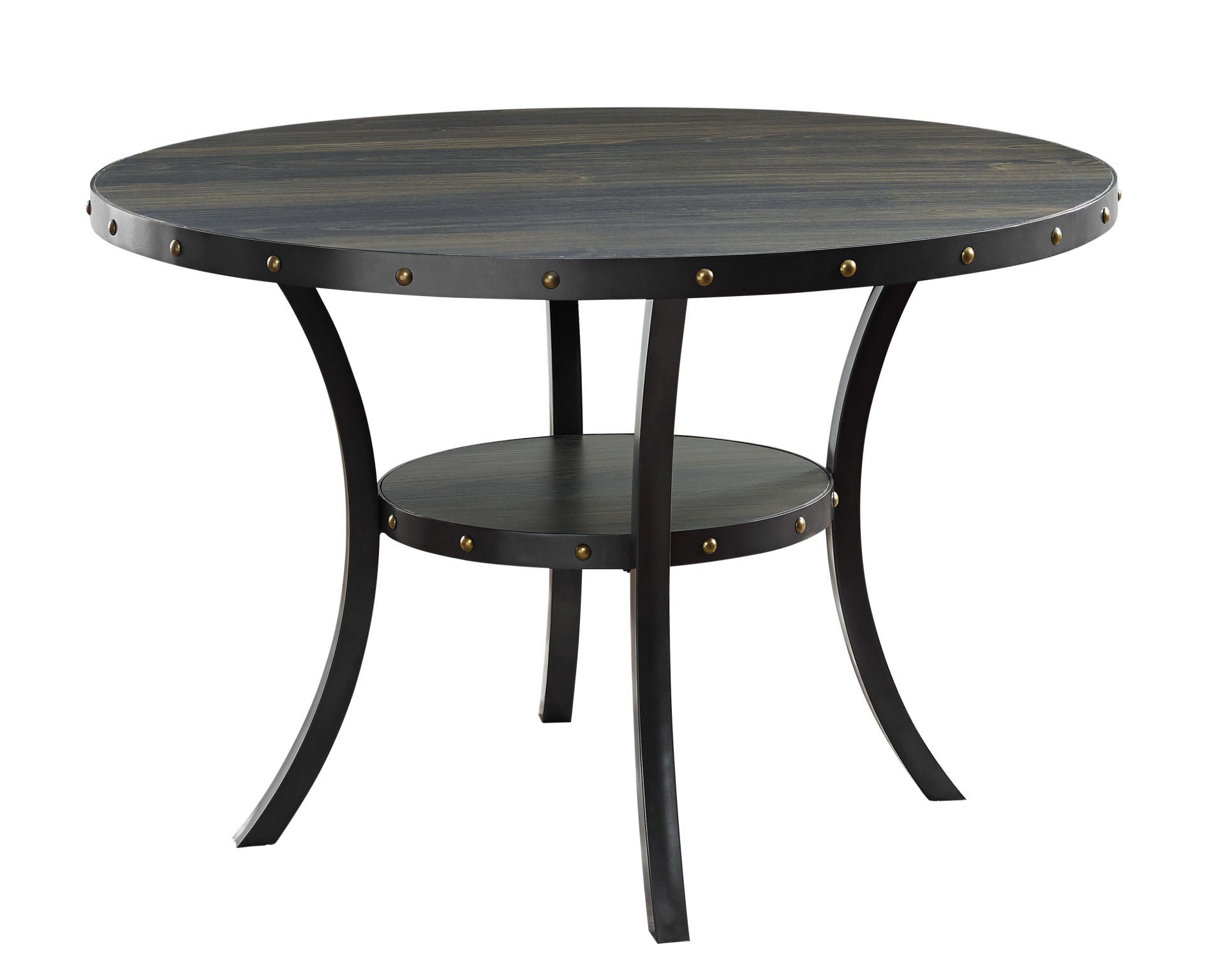 The Crispin Dining Table features a 48" round table top that easily accommodates 4 person seating. It is crafted of solid wood and manufactured wood and features a scratch, water and heat resistant melamine top. Study metal legs that add character and long-lasting quality highlight the contrasting trim with nailhead accents that circles the dining table. The unique wire brushed table top treatment highlights the smoky browns, black and grays in the wood finish. The handy storage shelf below the table top adds support and function. Perfect for dining rooms, kitchen nooks, media rooms-any where you need a casually rustic, durable and comfortable gathering table.