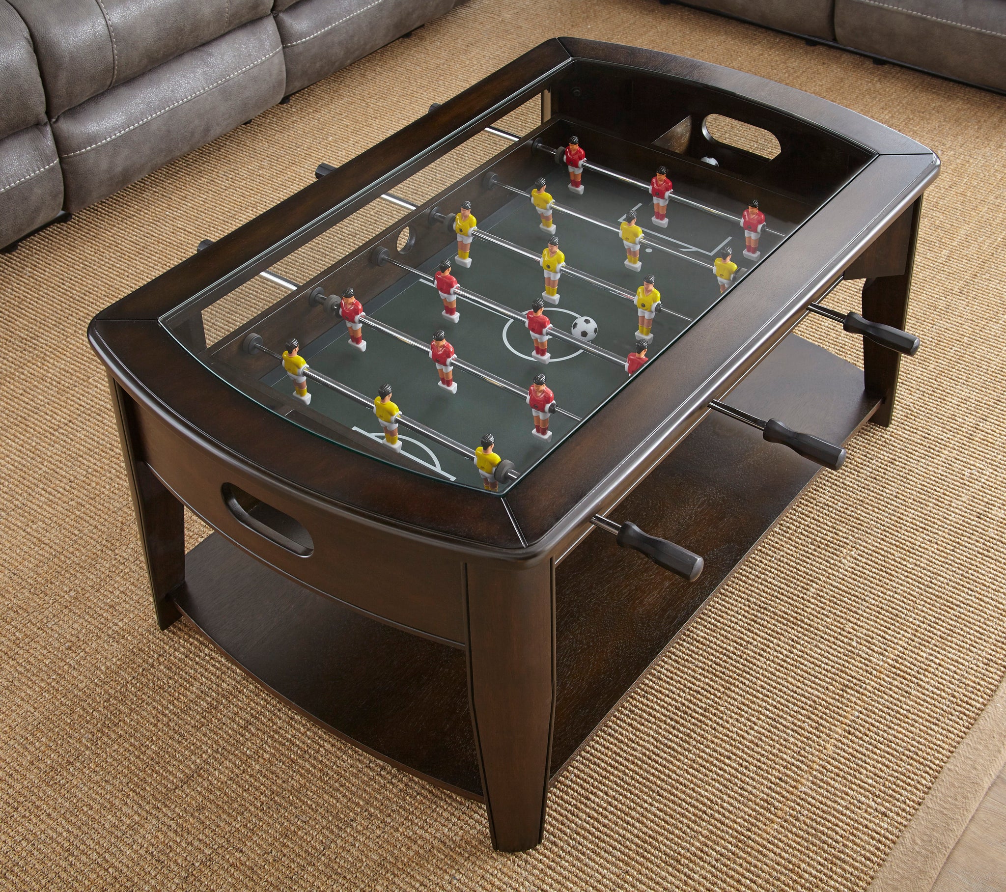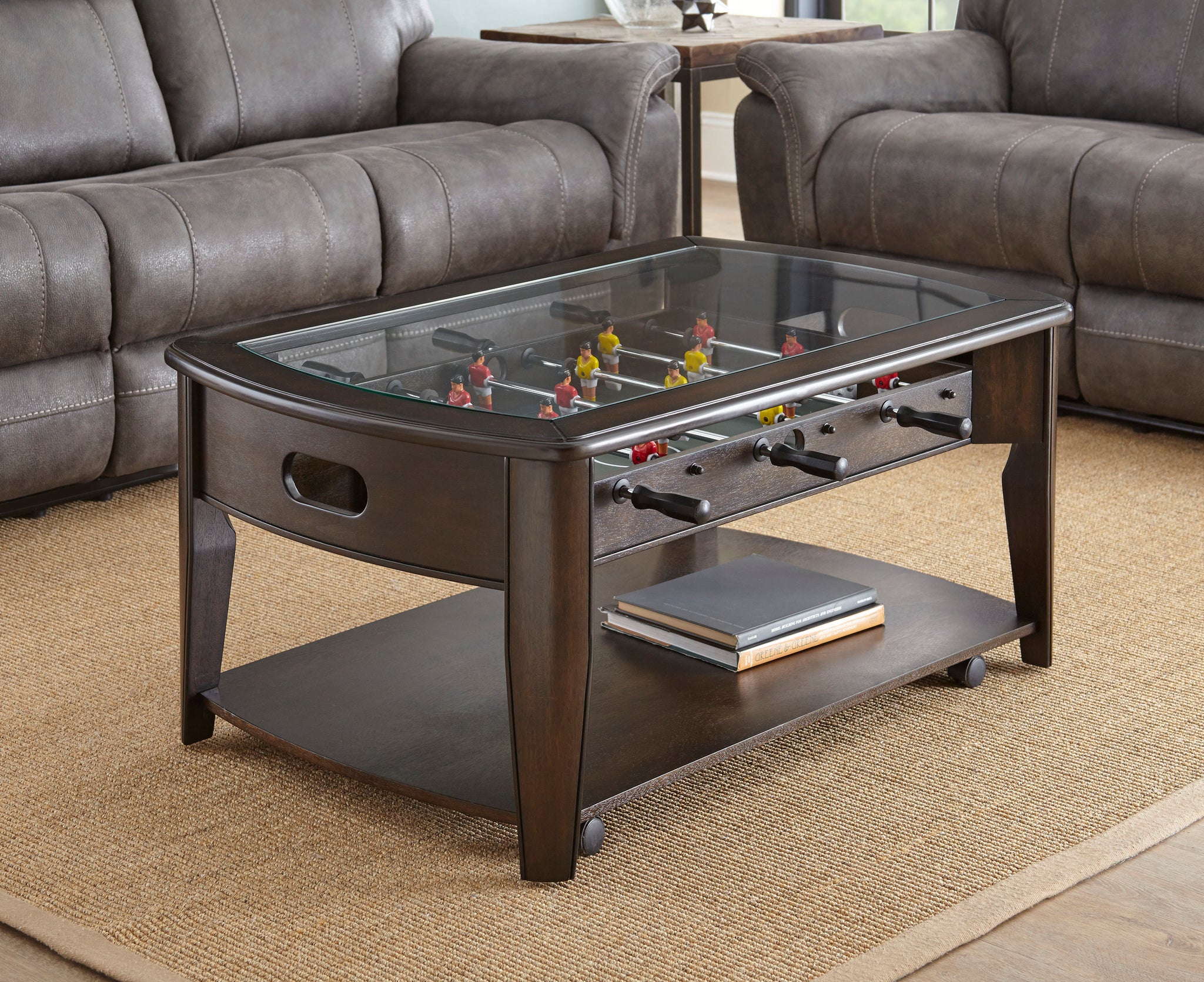 Enjoy your cocktail table with the Diletta cocktail table with foosball game bulit-in. This fully operational foosball table features tempered glass insert with two locking and three non-locking casters and all the game features to make this cocktail table a great addition to a game room or living room. End table features reversible top with chessboard.