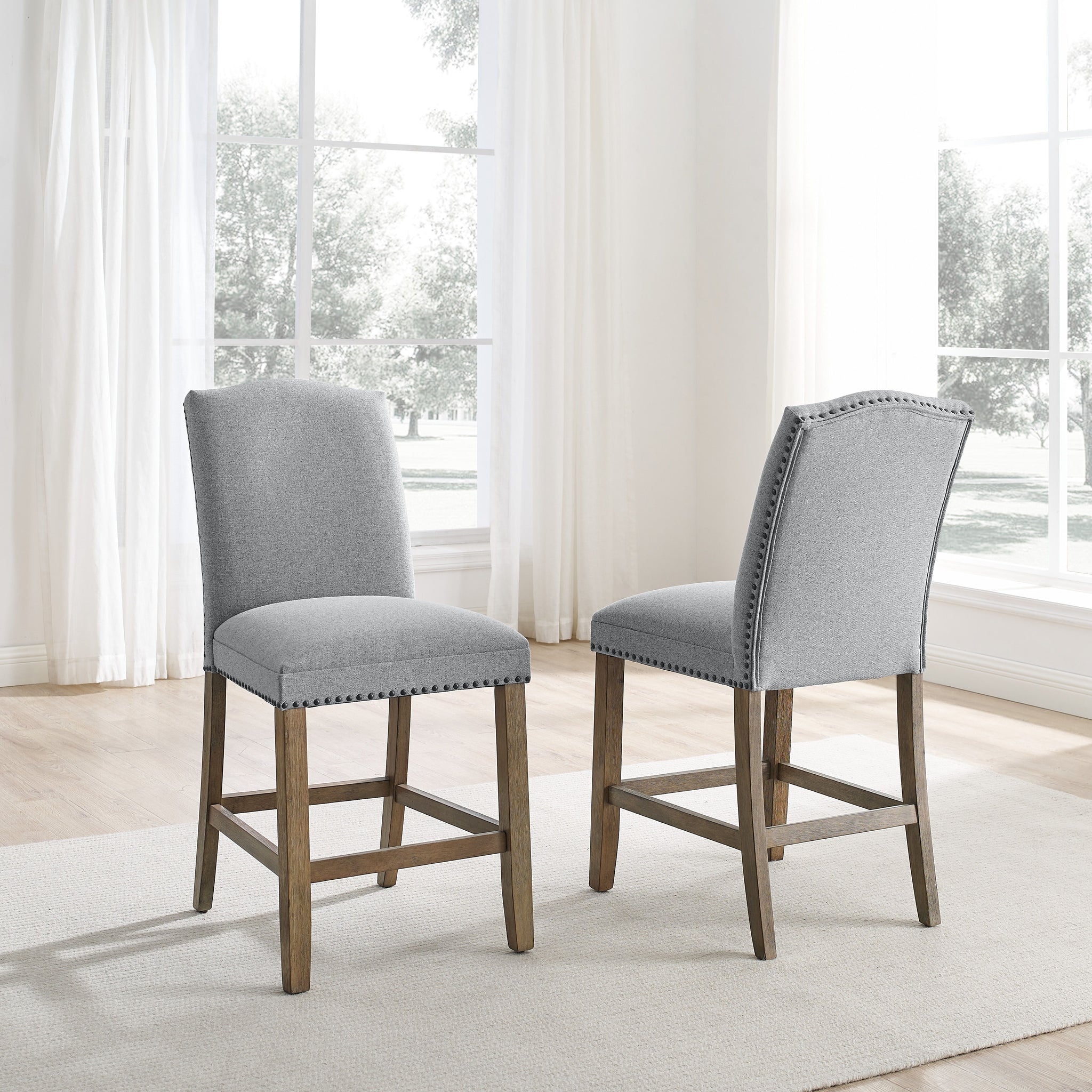 Refined rustic styling brings an elegant casual feel to the kitchen or dining area in the Grayson Counter Chair. The neutral Driftwood finish and ash-gray fabric is accented with a black nail head trim to blend well with many different decors. The 24? seat height on the chair allows a comfortable seat at 36? counters or to pair beautifully with the Grayson Counter Collection. Memory foam top layer and stretchers add to the comfort of the chair whether at a bar or table.
