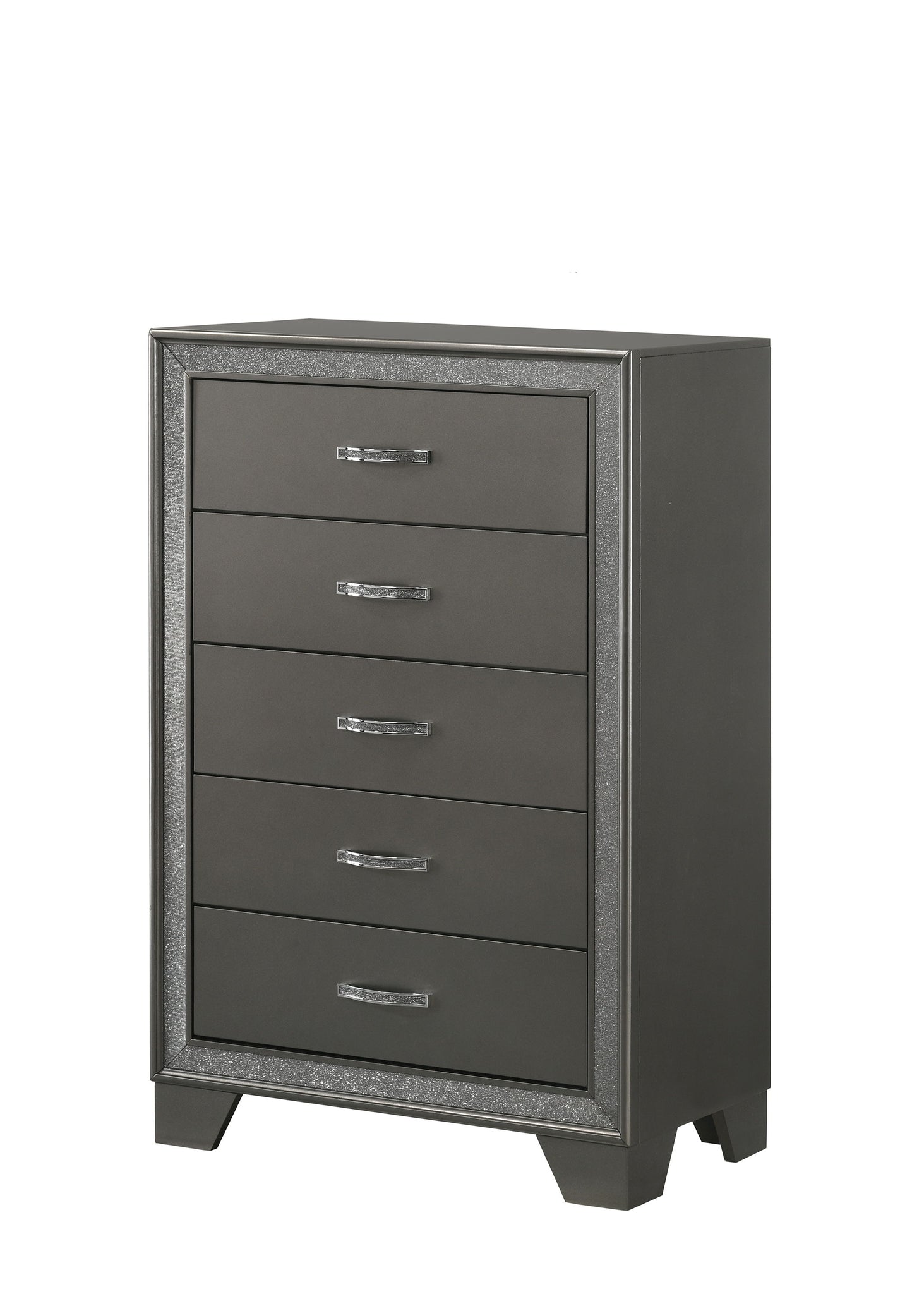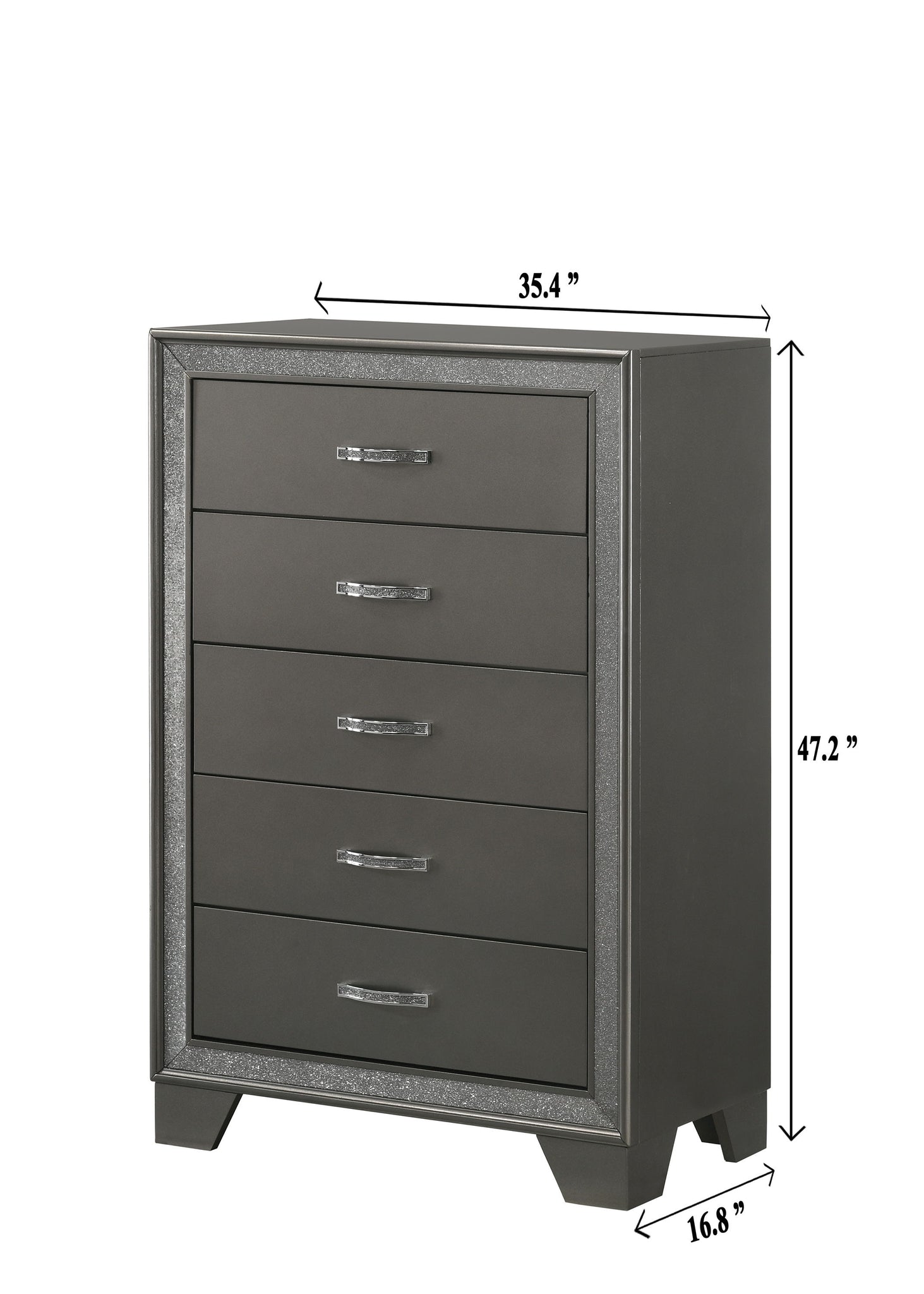 This luxurious bedroom collection exudes opulence with its dark, shimmering finishes and plush, tufted upholstery. The bed is a showstopper, featuring a high, tufted headboard that invites you to recline in comfort and style. Accompanying the bed are a matching dresser and chest, each boasting a sparkling trim that frames the rich, dark panels and complements the sleek, contemporary handles. The nightstand echoes the elegance of the bed, providing a convenient bedside space that doesn't skimp on glamour. Topped off with a generously sized mirror, the dresser completes this ensemble, reflecting both light and refined taste.