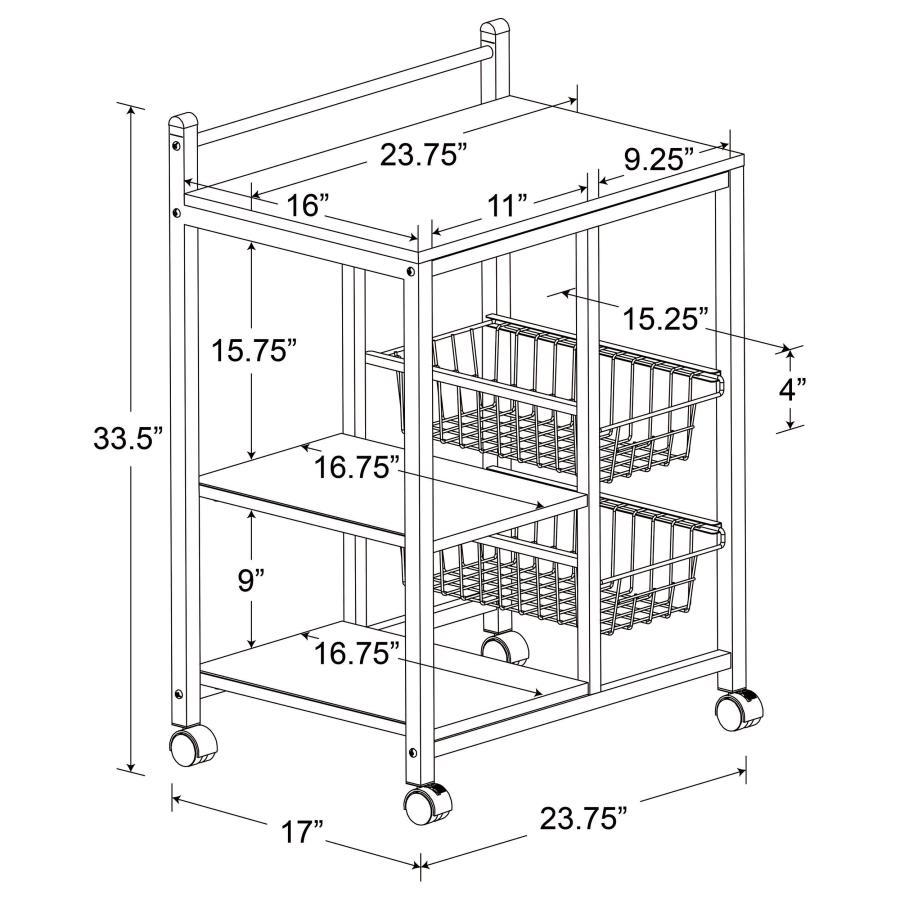 This is the Swiss army knife of kitchen carts. A spacious top shelf fits a good-sized microwave or toaster over. Duplex-type storage space has two shelves one side for dinnerware or cereal. The other side features two wire baskets for healthy snacks like apples and cherries. Multi-color cart has four wheels for rolling convenience when remodeling or simply to set next to the breakfast table.